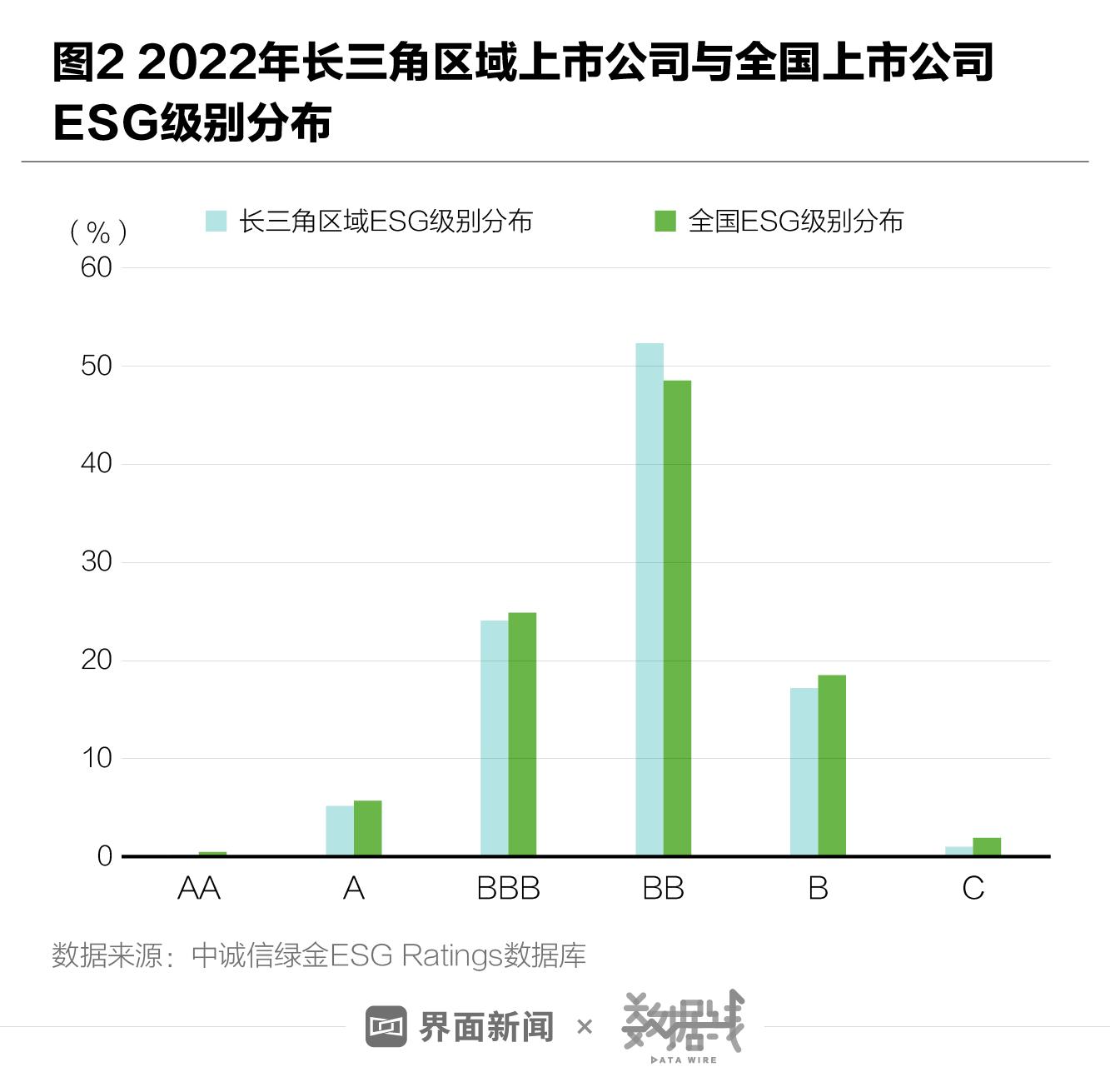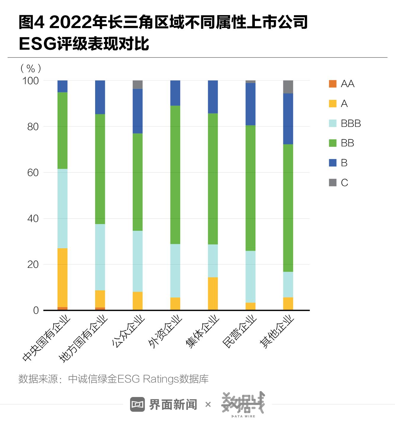 报告显示,2022年,长三角区域上市公司ESG级别呈正态分布,集中于BB级别,头部的AAA、AA级别公司数量较少,尾部C级别公司数量极少。长三角区域中央国有企业和地方国有企业的ESG评级表现明显优于其他属性企业。