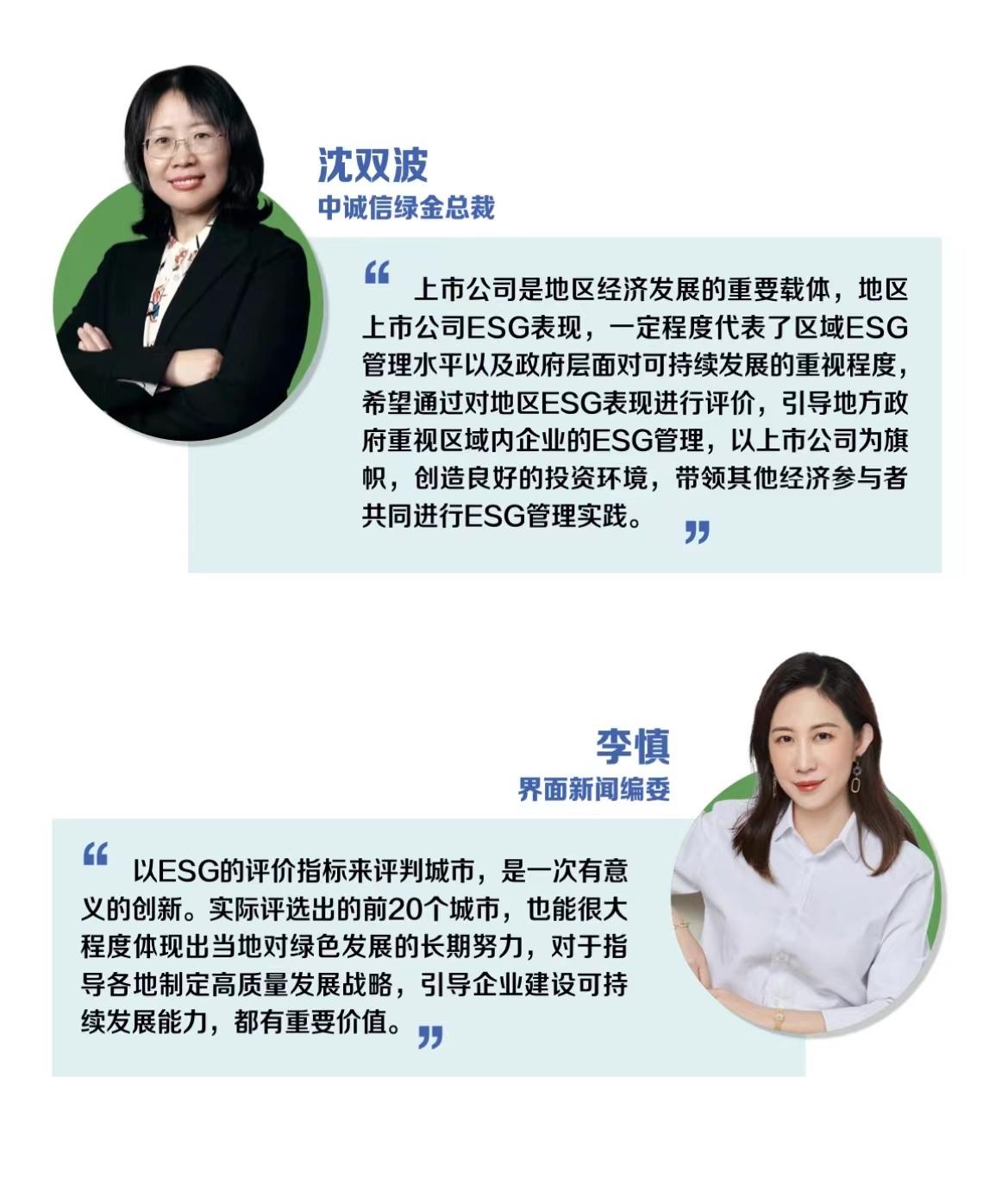 中诚信绿金总裁沈双波表示:“上市公司是地区经济发展的重要载体,地区上市公司ESG表现,一定程度代表了区域ESG管理水平以及政府层面对可持续发展的重视程度,希望通过对地区ESG表现进行评价,引导地方政府重视区域内企业的ESG管理,以上市公司为旗帜,创造良好的投资环境,带领其他经济参与者共同进行ESG管理实践。”