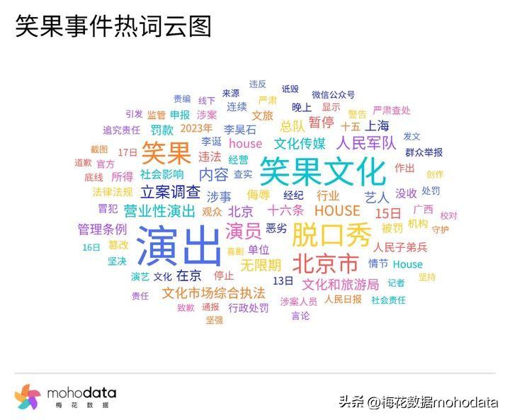 据梅花数据监测,此次笑果事件热词云图如上所示,其中“立案调查”“人民军队”“违法”“恶劣”“社会影响”“无期限”“行业””底线”“行政处罚”“追究责任”“严肃”等词汇排名较前。