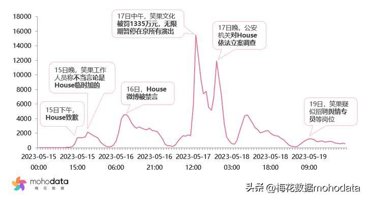 传播趋势如上所示,此次事件于5月15日登上热搜,当天涉事脱口秀演员和笑果文化均在微博发表声明致歉,但由于情节过于严重,网友并不接受,情绪高涨, 16日House微博被禁言,17日中午,北京市文旅局公布处罚结果,对笑果文化罚款1335万元,无限期暂停在京所有演出,舆情数据量达到顶峰,17晚,House被立案调查,舆情数据量达到次高峰,18日声量有小幅波动,19日因笑果文化疑似招聘舆情专员又引发一波讨论。