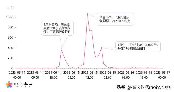 传播趋势如上所示,腾讯音乐节于6月14日开始售票,当天晚上就有网友发文曝光此次音乐节存在虚假宣传、跳票等诸多问题,热度快速攀升,15日,更多维权的网友在微博控诉,要求官方退票,吸引公众注意,午间时分,“澳门音乐节 退票”词条更是一度冲上热搜,另外,海南、福建等多地消防部门于当日在微博上发帖,科普遇到拥挤和踩踏如何保护自身安全,并带上“澳门音乐节退款”话题,舆情数据量达到顶峰。15晚,腾讯音乐娱乐旗下现场演出品牌“TME live”发布公告,开放48小时退票窗口,再次受到网友关注,不少维权网友带退票话题了解退款进度。
