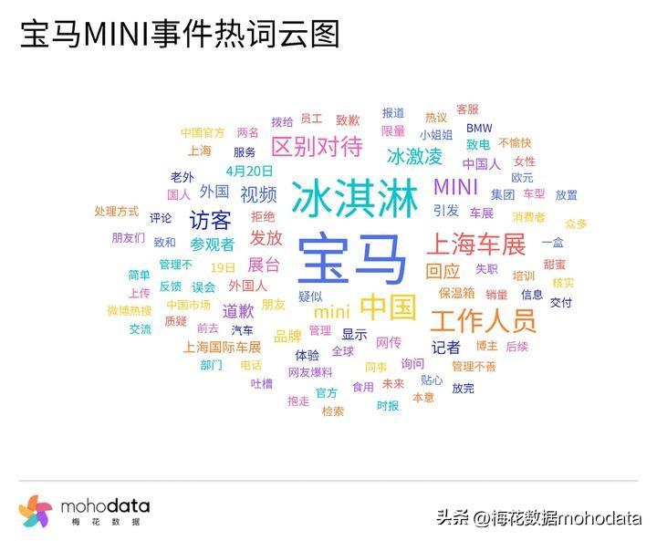 据梅花数据监测,本次宝马冰淇淋事件热词云图如上所示,其中“冰淇淋”“上海车展”“工作人员”“区别对待”“中国”“外国人”“回应”“道歉”等词汇排名较前。