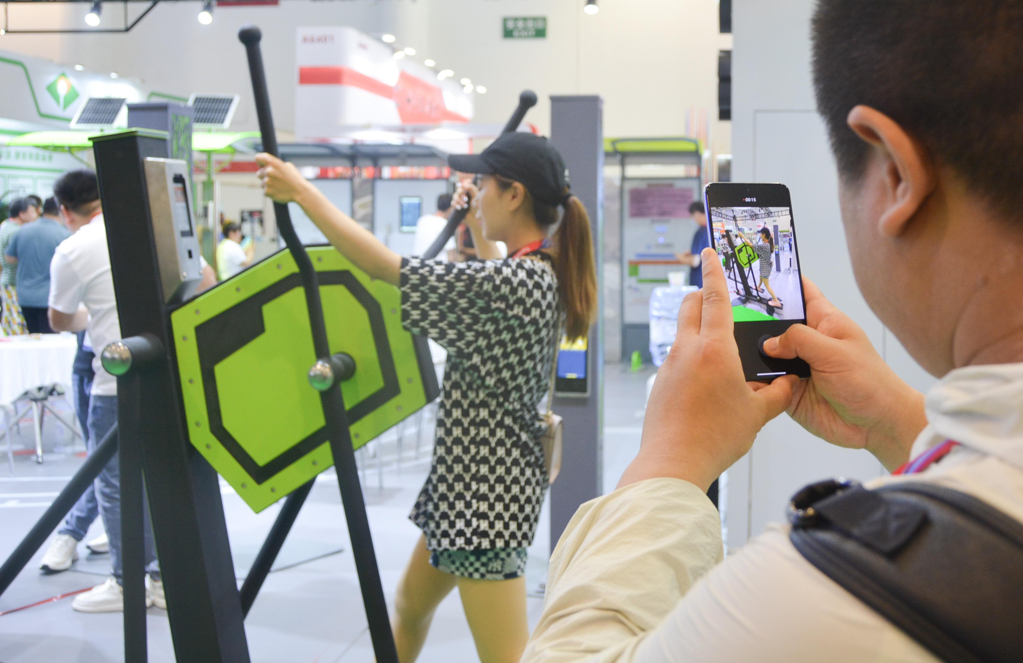 5月26日,观众体验智慧体育设施。当日,2023年(第40届)中国国际体育用品博览会在厦门国际会议展览中心开幕。新华社记者颜之宏摄