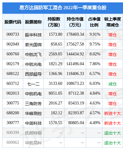 根据2022Q1季报基金重仓股数据,重仓该股的基金共81家,其中持有数量最多的基金为易方达国防军工混合。易方达国防军工混合目前规模为180.12亿元,最新净值1.463(4月28日),较上一交易日上涨1.32%,近一年上涨8.53%。该基金现任基金经理为何崇恺。何崇恺在任的公募基金包括:易方达积极成长混合,管理时间为2021年5月29日至今,期间收益率为-6.9%。