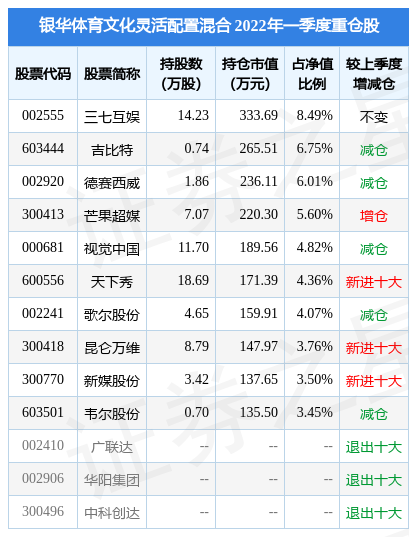 银华体育文化灵活配置混合的前十大重仓股如下: