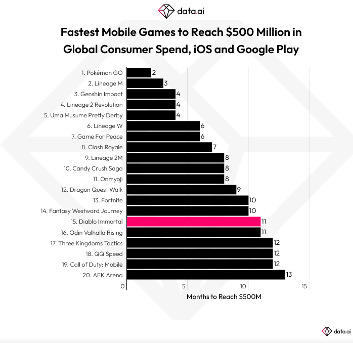 在第一年里,《暗黑破坏神:不朽》成为了最快突破 5 亿美元收入大关的第 15 款手游,在它前面的其他作品包括《宝可梦GO》、《糖果传奇》和《原神》等。接下来它将继续向 10 亿美元攀升。