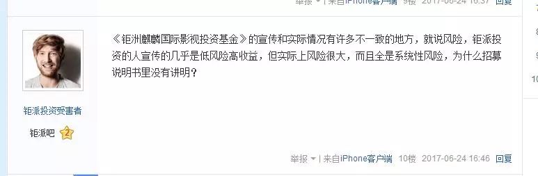 据“钜派投资受害者”的吧友称,钜派集团投资的“钜洲麒麟国际影视投资基金(S62820)宣传和实际情况有许多不一致的地方,钜派投资人宣传的几乎是低风险、高收益,但实际上风险很大,而且全是系统性风险,但投资人在招募说明书里并未讲明。