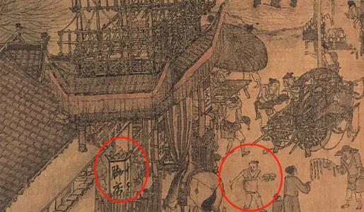 如果不想出门吃饭,可还馋饭店那口,外卖服务在现代人看来非常轻松,在宋朝的东京城一样不难。《清明上河图》中就能看到一个系着小围裙、拿着食盒的外卖小哥,出现在一家叫做十千脚店的店铺前。
