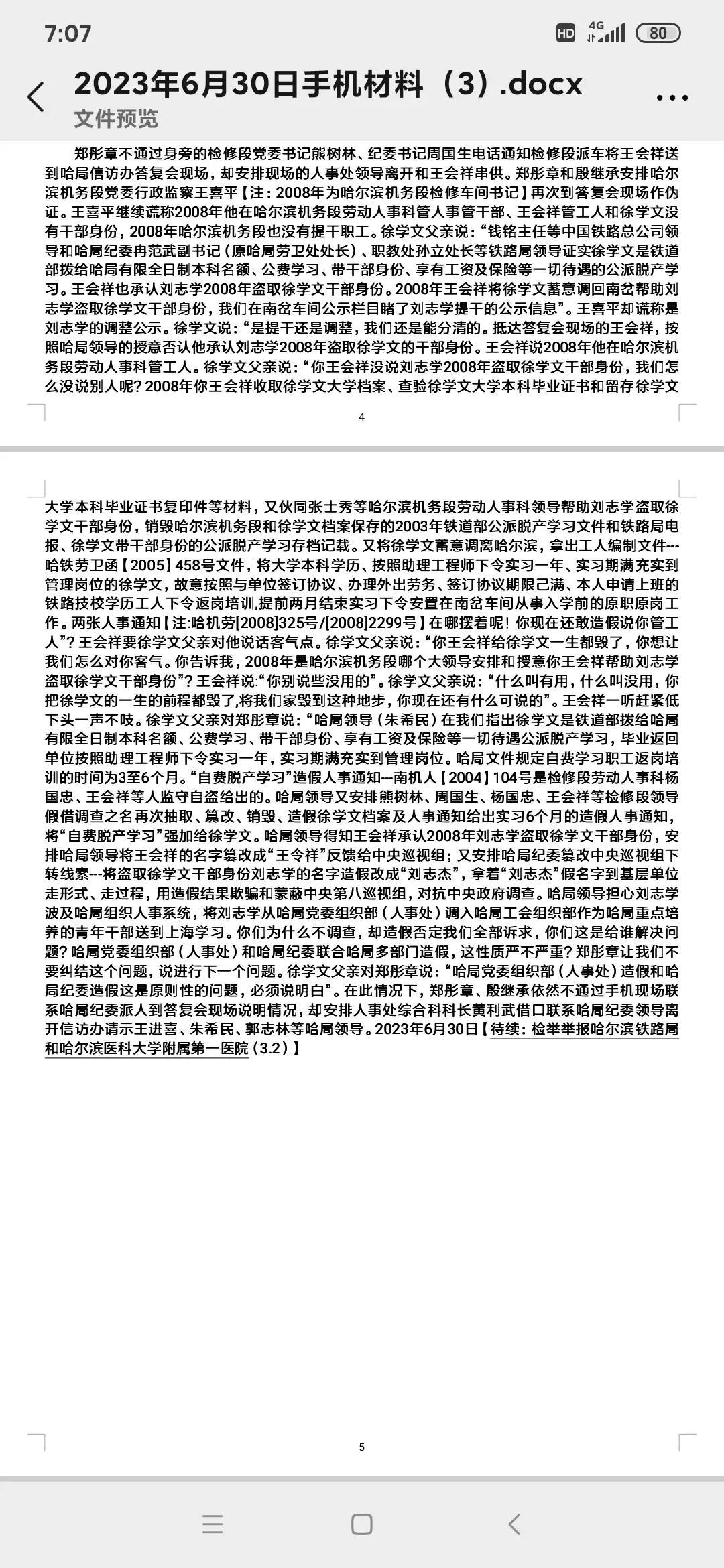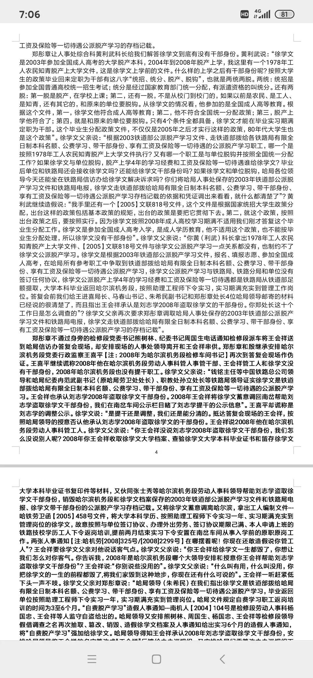 郑彤章不通过身旁的检修段党委书记熊树林、纪委书记周国生电话通知检修段派车将王会祥送到哈局信访办答复会现场,却安排现场的人事处领导离开和王会祥串供。郑彤章和殷继承安排哈尔滨机务段党委行政监察王喜平【注:2008年为哈尔滨机务段检修车间书记】再次到答复会现场作伪证。王喜平继续谎称2008年他在哈尔滨机务段劳动人事科管人事管干部、王会祥管工人和徐学文没有干部身份,2008年哈尔滨机务段也没有提干职工。徐学文父亲说:“钱铭主任等中国铁路总公司领导和哈局纪委冉范武副书记(原哈局劳卫处处长)、职教处孙立处长等铁路局领导证实徐学文是铁道部拨给哈局有限全日制本科名额、公费学习、带干部身份、享有工资及保险等一切待遇的公派脱产学习。王会祥也承认刘志学2008年盗取徐学文干部身份。2008年王会祥将徐学文蓄意调回南岔帮助刘志学盗取徐学文干部身份,我们在南岔车间公示栏目睹了刘志学提干的公示信息”。王喜平却谎称是刘志学的调整公示。徐学文说:“是提干还是调整,我们还是能分清的。抵达答复会现场的王会祥,按照哈局领导的授意否认他承认刘志学2008年盗取徐学文的干部身份。王会祥说2008年他在哈尔滨机务段劳动人事科管工人。徐学文父亲说:“你王会祥没说刘志学2008年盗取徐学文干部身份,我们怎么没说别人呢?2008年你王会祥收取徐学文大学档案、查验徐学文大学本科毕业证书和留存徐学文大学本科毕业证书复印件等材料,又伙同张士秀等哈尔滨机务段劳动人事科领导帮助刘志学盗取徐学文干部身份,销毁哈尔滨机务段和徐学文档案保存的2003年铁道部公派脱产学习文件和铁路局电报、徐学文带干部身份的公派脱产学习存档记载。又将徐学文蓄意调离哈尔滨,拿出工人编制文件---哈铁劳卫函【2005】458号文件,将大学本科学历、按照助理工程师下令实习一年、实习期满充实到管理岗位的徐学文,故意按照与单位签订协议、办理外出劳务、签订协议期限己满、本人申请上班的铁路技校学历工人下令返岗培训,提前两月结束实习下令安置在南岔车间从事入学前的原职原岗工作。两张人事通知【注:哈机劳[2008]325号/[2008]2299号】在哪摆着呢!你现在还敢造假说你管工人”?王会祥要徐学文父亲对他说话客气点。徐学文父亲说:“你王会祥给徐学文一生都毁了,你想让我们怎么对你客气。你告诉我,2008年是哈尔滨机务段哪个大领导安排和授意你王会祥帮助刘志学盗取徐学文干部身份”?王会祥说:“你别说些没用的”。徐学文父亲说:“什么叫有用,什么叫没用,你把徐学文的一生的前程都毁了,将我们家毁到这种地步,你现在还有什么可说的”。王会祥一听赶紧低下头一声不吱。徐学文父亲对郑彤章说:“哈局领导(朱希民)在我们指出徐学文是铁道部拨给哈局有限全日制本科名额、公费学习、带干部身份、享有工资及保险等一切待遇公派脱产学习,毕业返回单位按照助理工程师下令实习一年,实习期满充实到管理岗位。哈局文件规定自费学习职工返岗培训的时间为3至6个月。“自费脱产学习”造假人事通知---南机人【2004】104号是检修段劳动人事科杨国忠、王会祥等人监守自盗给出的。哈局领导又安排熊树林、周国生、杨国忠、王会祥等检修段领导假借调查之名再次抽取、篡改、销毁、造假徐学文档案及人事通知给出实习6个月的造假人事通知,将“自费脱产学习”强加给徐学文。哈局领导得知王会祥承认2008年刘志学盗取徐学文干部身份,安排哈局领导将王会祥的名字篡改成“王令祥”反馈给中央巡视组;又安排哈局纪委篡改中央巡视组下转线索---将盗取徐学文干部身份刘志学的名字造假改成“刘志杰”,拿着“刘志杰”假名字到基层单位走形式、走过程,用造假结果欺骗和蒙蔽中央第八巡视组,对抗中央政府调查。哈局领导担心刘志学波及哈局组织人事系统,将刘志学从哈局党委组织部(人事处)调入哈局工会组织部作为哈局重点培养的青年干部送到上海学习。你们为什么不调查,却造假否定我们全部诉求,你们这是给谁解决问题?哈局党委组织部(人事处)和哈局纪委联合哈局多部门造假,这性质严不严重?郑彤章让我们不要纠结这个问题,说进行下一个问题。徐学文父亲对郑彤章说:“哈局党委组织部(人事处)造假和哈局纪委造假这是原则性的问题,必须说明白”。在此情况下,郑彤章、殷继承依然不通过手机现场联系哈局纪委派人到答复会现场说明情况,却安排人事处综合科科长黄利武借口联系哈局纪委领导离开信访办请示王进喜、朱希民、郭志林等哈局领导。2023年6月30日【待续:检举举报哈尔滨铁路局和哈尔滨医科大学附属第一医院(3.2)】