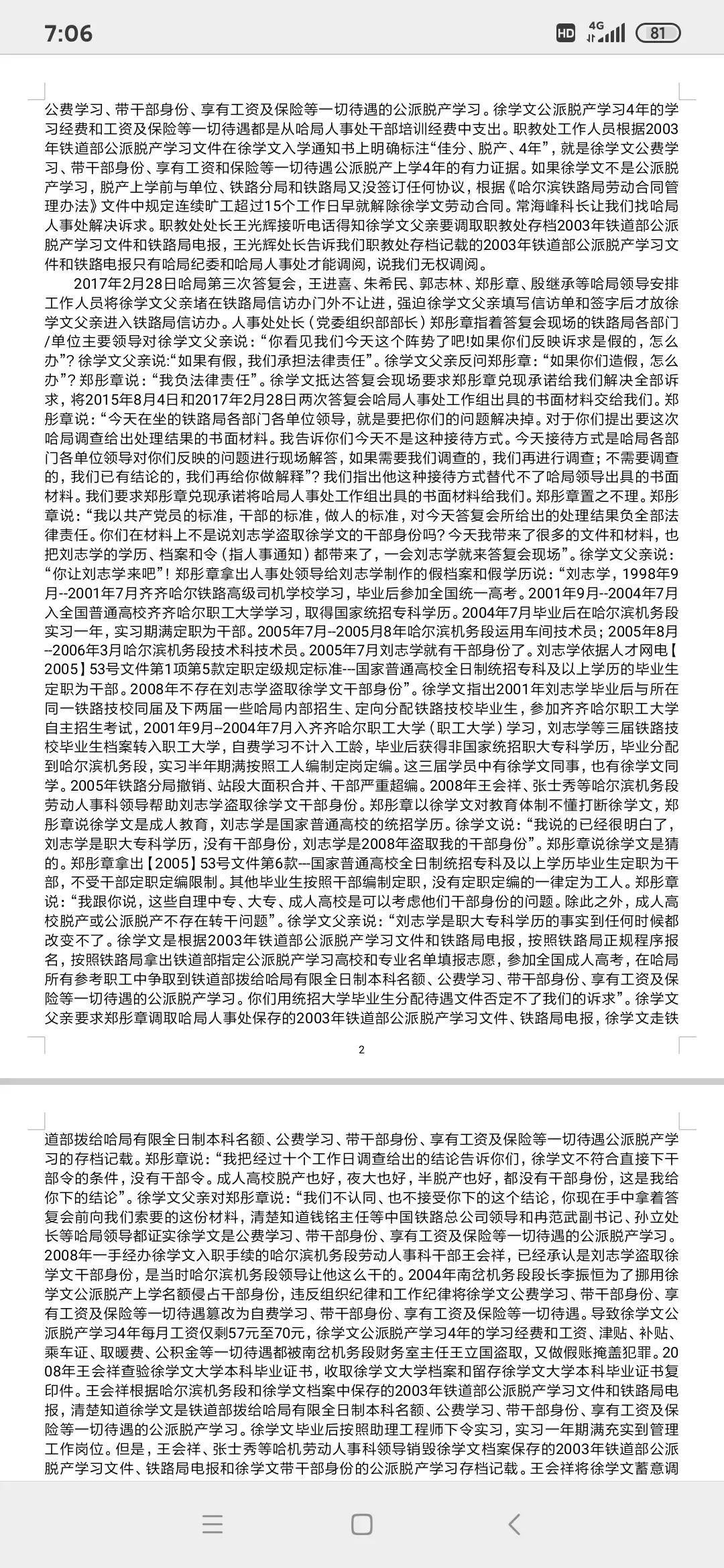 2017年2月28日哈局第三次答复会,王进喜、朱希民、郭志林、郑彤章、殷继承等哈局领导安排工作人员将徐学文父亲堵在铁路局信访办门外不让进,强迫徐学文父亲填写信访单和签字后才放徐学文父亲进入铁路局信访办。人事处处长(党委组织部部长)郑彤章指着答复会现场的铁路局各部门/单位主要领导对徐学文父亲说:“你看见我们今天这个阵势了吧!如果你们反映诉求是假的,怎么办”?徐学文父亲说:“如果有假,我们承担法律责任”。徐学文父亲反问郑彤章:“如果你们造假,怎么办”?郑彤章说:“我负法律责任”。徐学文抵达答复会现场要求郑彤章兑现承诺给我们解决全部诉求,将2015年8月4日和2017年2月28日两次答复会哈局人事处工作组出具的书面材料交给我们。郑彤章说:“今天在坐的铁路局各部门各单位领导,就是要把你们的问题解决掉。对于你们提出要这次哈局调查给出处理结果的书面材料。我告诉你们今天不是这种接待方式。今天接待方式是哈局各部门各单位领导对你们反映的问题进行现场解答,如果需要我们调查的,我们再进行调查;不需要调查的,我们已有结论的,我们再给你做解释”?我们指出他这种接待方式替代不了哈局领导出具的书面材料。我们要求郑彤章兑现承诺将哈局人事处工作组出具的书面材料给我们。郑彤章置之不理。郑彤章说:“我以共产党员的标准,干部的标准,做人的标准,对今天答复会所给出的处理结果负全部法律责任。你们在材料上不是说刘志学盗取徐学文的干部身份吗?今天我带来了很多的文件和材料,也把刘志学的学历、档案和令(指人事通知)都带来了,一会刘志学就来答复会现场”。徐学文父亲说:“你让刘志学来吧”!郑彤章拿出人事处领导给刘志学制作的假档案和假学历说:“刘志学,1998年9月--2001年7月齐齐哈尔铁路高级司机学校学习,毕业后参加全国统一高考。2001年9月--2004年7月入全国普通高校齐齐哈尔职工大学学习,取得国家统招专科学历。2004年7月毕业后在哈尔滨机务段实习一年,实习期满定职为干部。2005年7月--2005月8年哈尔滨机务段运用车间技术员;2005年8月--2006年3月哈尔滨机务段技术科技术员。2005年7月刘志学就有干部身份了。刘志学依据人才网电【2005】53号文件第1项第5款定职定级规定标准---国家普通高校全日制统招专科及以上学历的毕业生定职为干部。2008年不存在刘志学盗取徐学文干部身份”。徐学文指出2001年刘志学毕业后与所在同一铁路技校同届及下两届一些哈局内部招生、定向分配铁路技校毕业生,参加齐齐哈尔职工大学自主招生考试,2001年9月--2004年7月入齐齐哈尔职工大学(职工大学)学习,刘志学等三届铁路技校毕业生档案转入职工大学,自费学习不计入工龄,毕业后获得非国家统招职大专科学历,毕业分配到哈尔滨机务段,实习半年期满按照工人编制定岗定编。这三届学员中有徐学文同事,也有徐学文同学。2005年铁路分局撤销、站段大面积合并、干部严重超编。2008年王会祥、张士秀等哈尔滨机务段劳动人事科领导帮助刘志学盗取徐学文干部身份。郑彤章以徐学文对教育体制不懂打断徐学文,郑彤章说徐学文是成人教育,刘志学是国家普通高校的统招学历。徐学文说:“我说的已经很明白了,刘志学是职大专科学历,没有干部身份,刘志学是2008年盗取我的干部身份”。郑彤章说徐学文是猜的。郑彤章拿出【2005】53号文件第6款---国家普通高校全日制统招专科及以上学历毕业生定职为干部,不受干部定职定编限制。其他毕业生按照干部编制定职,没有定职定编的一律定为工人。郑彤章说:“我跟你说,这些自理中专、大专、成人高校是可以考虑他们干部身份的问题。除此之外,成人高校脱产或公派脱产不存在转干问题”。徐学文父亲说:“刘志学是职大专科学历的事实到任何时候都改变不了。徐学文是根据2003年铁道部公派脱产学习文件和铁路局电报,按照铁路局正规程序报名,按照铁路局拿出铁道部指定公派脱产学习高校和专业名单填报志愿,参加全国成人高考,在哈局所有参考职工中争取到铁道部拨给哈局有限全日制本科名额、公费学习、带干部身份、享有工资及保险等一切待遇的公派脱产学习。你们用统招大学毕业生分配待遇文件否定不了我们的诉求”。徐学文父亲要求郑彤章调取哈局人事处保存的2003年铁道部公派脱产学习文件、铁路局电报,徐学文走铁道部拨给哈局有限全日制本科名额、公费学习、带干部身份、享有工资及保险等一切待遇公派脱产学习的存档记载。郑彤章说:“我把经过十个工作日调查给出的结论告诉你们,徐学文不符合直接下干部令的条件,没有干部令。成人高校脱产也好,夜大也好,半脱产也好,都没有干部身份,这是我给你下的结论”。徐学文父亲对郑彤章说:“我们不认同、也不接受你下的这个结论,你现在手中拿着答复会前向我们索要的这份材料,清楚知道钱铭主任等中国铁路总公司领导和冉范武副书记、孙立处长等哈局领导都证实徐学文是公费学习、带干部身份、享有工资及保险等一切待遇的公派脱产学习。2008年一手经办徐学文入职手续的哈尔滨机务段劳动人事科干部王会祥,已经承认是刘志学盗取徐学文干部身份,是当时哈尔滨机务段领导让他这么干的。2004年南岔机务段段长李振恒为了挪用徐学文公派脱产上学名额侵占干部身份,违反组织