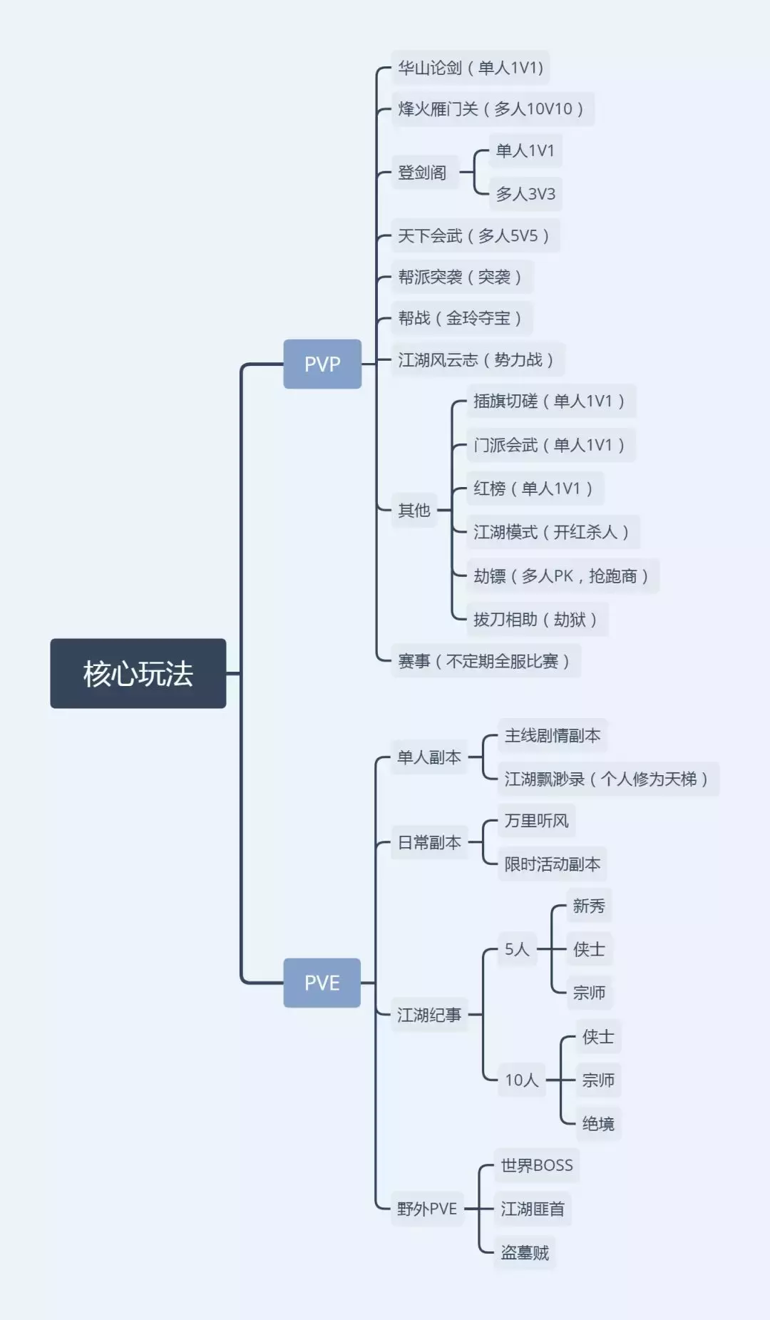 设计多样的副本用于产出不同的资源,辅之不同的PVE玩法,同时在一些活动副本设置不同的难度级别,对玩家也设置了不同的门槛,刺激玩家提升消费提升修为。比如【万里听风】【弈客行】和【江湖纪事-新秀】可以轻松完成,【江湖纪事-侠士】副本(包括5人、10人)难度不小,但玩家跟着大部队成长,0氪党也可以搞定,开发组似乎还设计了侠士副本按照玩家等级确定BOSS等级,对于新手或低修为的玩家也是足够友善。一些挑战副本每周一次,普通本可以挂机。而真正的挑战副本是宗士和绝境本,亦有不同的难度区分。