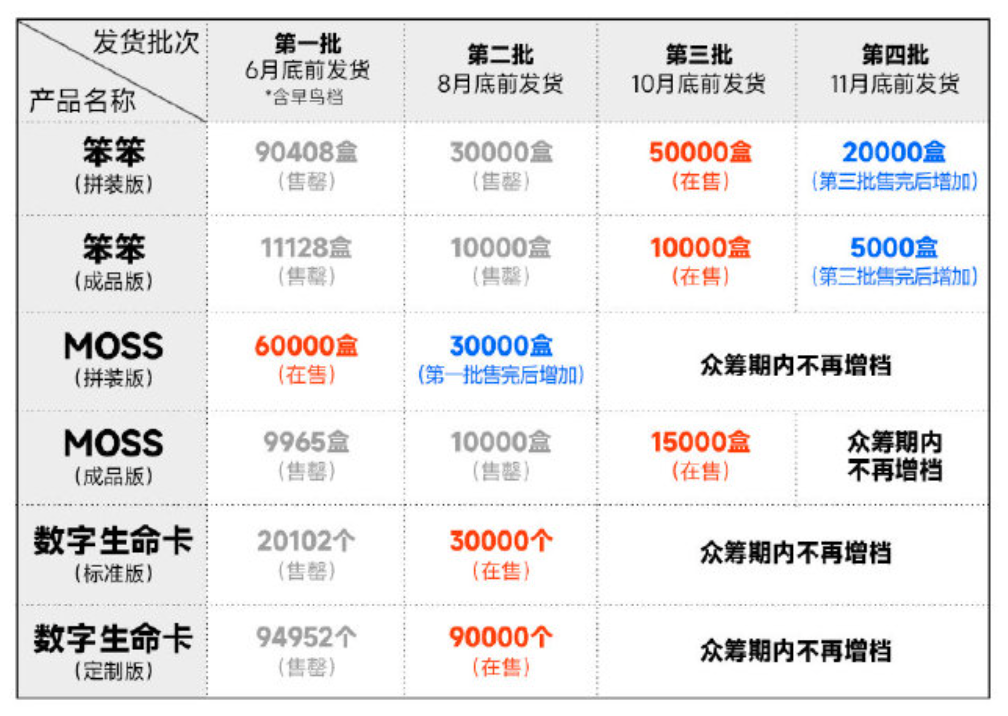 尽管已在激增的市场需求下多次增档,但笨笨拼装版&成品版与MOSS成品版的第一批与第二批产品均已售罄,上述产品销量已经超过16万盒。而即便是第一批售罄的产品,发货时间都已经到今年6月。1月31日,赛凡科幻空间相关负责人以目前正加紧生产为由,婉拒了时代周报记者的采访。