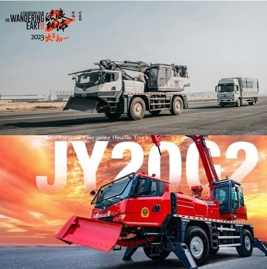 电影中,JY20抢险救援消防车身披“白色战袍”十分帅酷。外观上看,就像一台全地面起重机,在车体之上“加装”了一台挖掘机——这正是它的最大特色。4x4全轮驱动+全轮转向+长行程液压气动悬挂,令其越野性能大为增强。值得一提的是,它还采用了“一臂多能”设计理念,无需外部辅助就可快速切换属具,还搭载了照明灯杆、随车发电机等配置,实现“一车多能”。