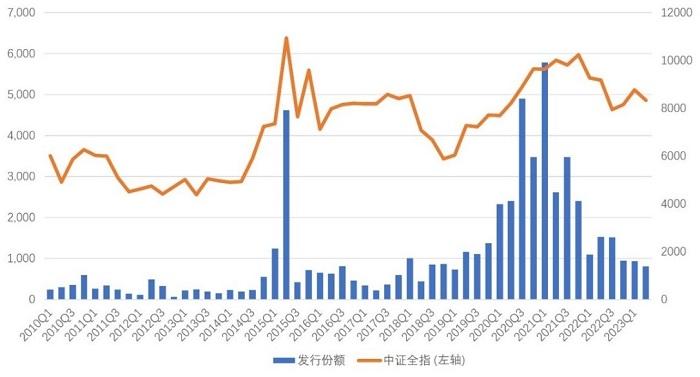 (数据来源:Wind,2010/1/1-2023/6/30,基金发行份额剔除货币基金与纯债基金,指数过往表现不预示未来。)