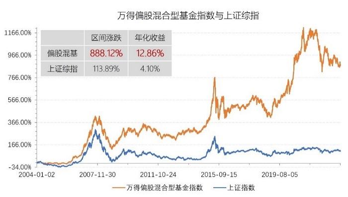 长期来看,基金整体上能够取得较为亮眼的回报。以万得偏股混合基金指数为例,自基期以来近20年间,年化收益达到12.86%,涨幅远超上证综指。