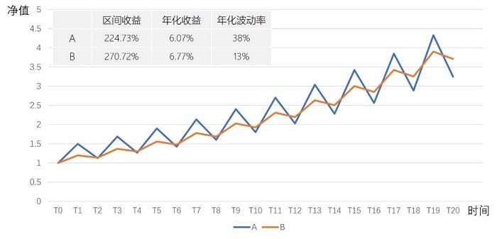 举个例子:有两只产品A和B,A第一年涨幅50%,第二年跌幅-25%,B第一年涨幅20%,第二年跌幅-5%,短期来看两年后收益接近;但如此重复10次,也就是20年后,B的收益是明显高于A的,充分说明控制回撤在长期投资中的重要性。